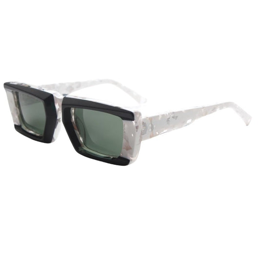 MCROONS glasses feature a chunky rectangular design with a striking teal and black marbled pattern. The warm brown-tinted lenses provide a cozy contrast, enhancing comfort and style. Perfect for those looking to add a bold touch to their wardrobe, these glasses seamlessly blend trendy aesthetics with functional design, making them ideal for both casual and upscale events.