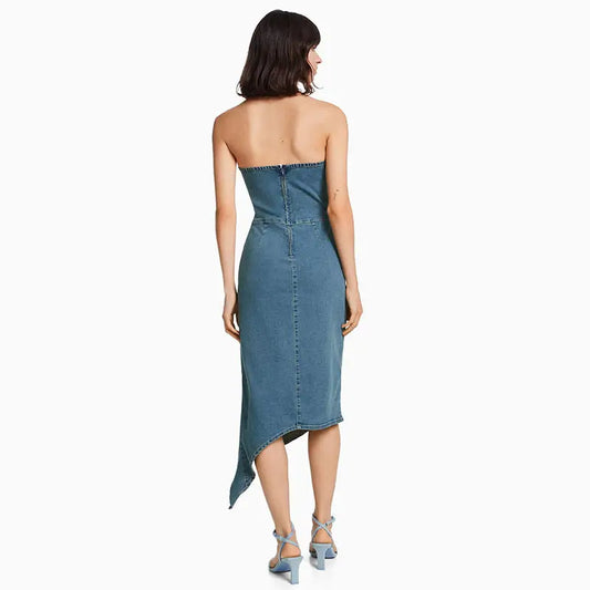 Asymmetrical Strapless Pleated Denim Midi Dress for Women Step out in style with this chic and contemporary denim midi dress, perfect for summer outings. Style: Asymmetrical design that flatters various body shapes, featuring a strapless neckline. Material: Crafted from high-quality denim for comfort and durability. Details: Pleated front and a stylish slit that adds a touch of elegance and movement. Fit: Tailored to accentuate the waist while providing a relaxed fit through the skirt. Versatility: Suitable for casual day events or dressed up for evening occasions. Key Features: Customizable options available Trendy denim fabric that pairs well with heels or sandals Ideal for summer gatherings, parties, and special occasions