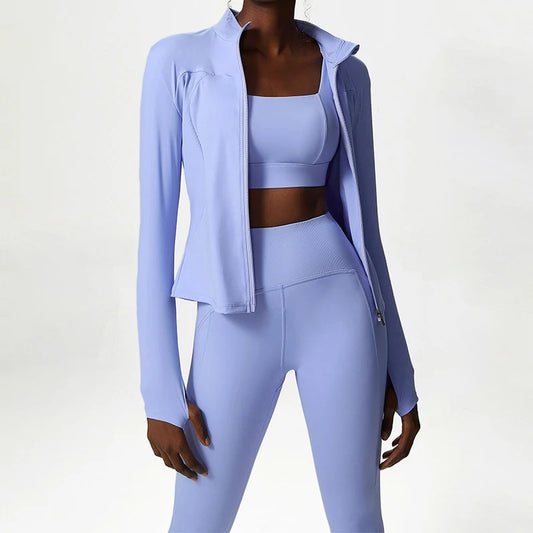 Three-Piece Set: Includes a sports bra, high-waisted leggings, and a matching outer layer.