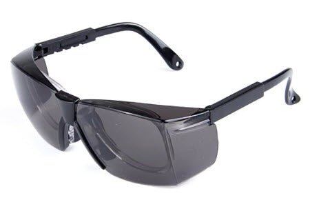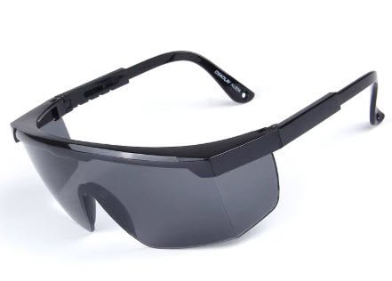 MCROONS Protective Glasses have a durable black frame and dark gray lenses for glare reduction and UV protection; their wraparound design ensures comprehensive eye coverage while blending safety with a modern aesthetic.