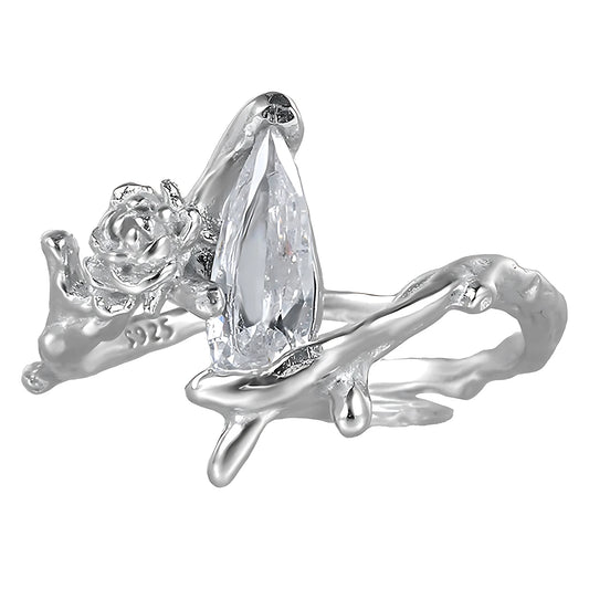 Rose Teardrop Zircon Ring S925 Sterling Silver Adjustable Textured Unique Designer Jewelry for Women Statement Fine Silver Rings