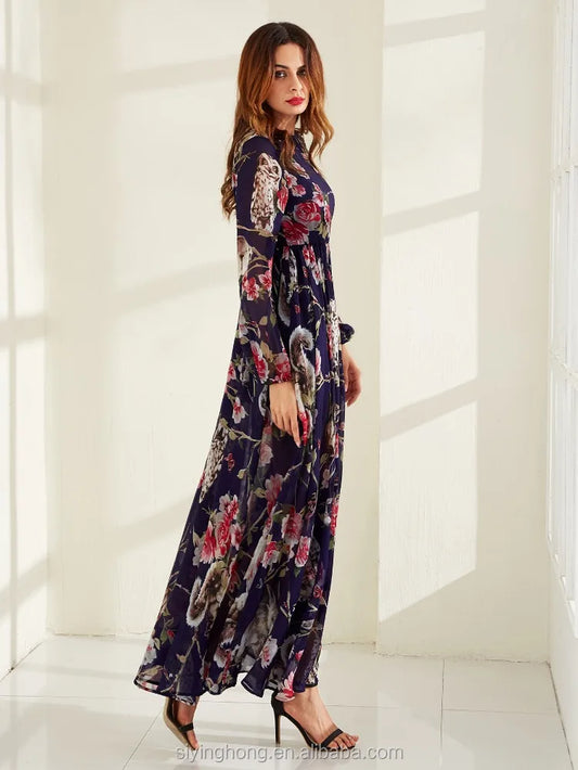 Plus Size OEM Latest Design Oversize Printed Flower Long Sleeve Chiffon Kaftan Abaya