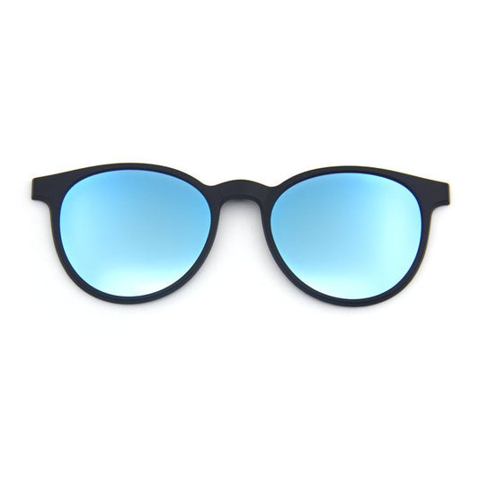 MCROONS eyewear set includes a stylish black frame and four clip-on sunglasses lenses in different colors (gray, yellow, mirrored silver, and blue). The lenses provide options for varying light conditions and personal style preferences. The accompanying case offers protection and portability, making it ideal for everyday use or travel.