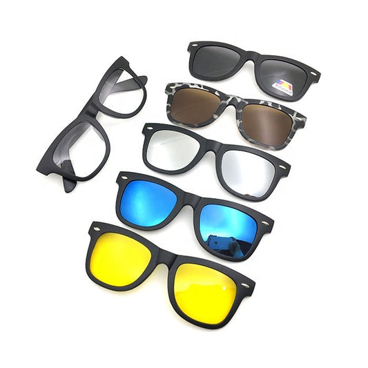 MCROONS product includes a pair of black sunglasses with clear lenses and an additional red frame. The set comes with three clip-on lenses in yellow, blue, and dark gray. This combination allows for easy adaptation to various lighting conditions and personal styles. The lightweight design ensures comfort for everyday wear and outdoor activities.
