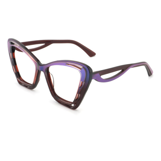 MCROONS glasses feature a striking cat-eye design with a rich burgundy frame adorned with vibrant purple and orange accents. The clear lenses enhance visibility while contributing to the bold aesthetic. The angular shape adds a contemporary twist, making these glasses an ideal choice for fashion-forward individuals. Perfect for both casual and elegant occasions, they are designed to make a memorable statement.