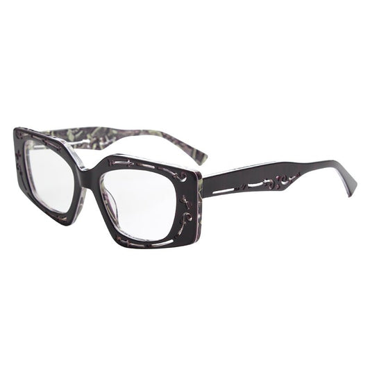 MCROONS glasses feature an oversized hexagonal design with a playful mix of purple and yellow tortoiseshell patterns. The vibrant colors and unique shape create a bold fashion statement. Clear lenses enhance visibility while complementing the artistic design. Ideal for those looking to express their individuality, these glasses are versatile enough for both casual and formal settings, effortlessly merging style with creativity.