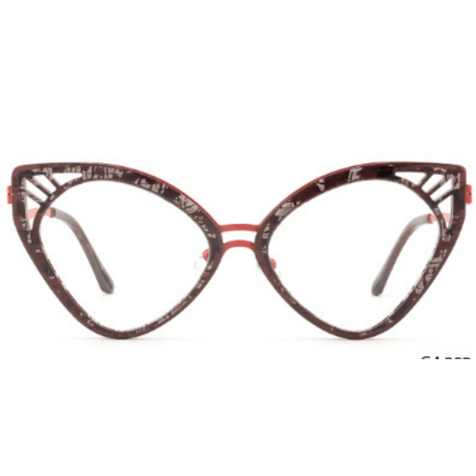 MCROONS glasses feature a striking oval design with a vibrant red frame accented by playful patterns in orange, black, and white. The clear lenses add functionality while enhancing the bold and artistic aesthetic. This retro-inspired shape makes these glasses a standout accessory for those looking to express their unique style. Ideal for casual outings or creative settings, they effortlessly blend color and flair, making a memorable fashion statement.