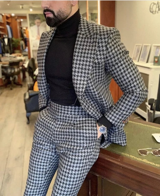 Step into sophistication with this stylish houndstooth suit, perfect for the autumn and winter seasons.
