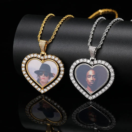 Iced Out Diamond Memory Photo Pendant Hip Hop Jewelry Custom Rotating Heart Photo Necklace