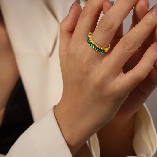 Elegant Green Design: Features luxurious green cubic zirconia stones arranged in a sleek, minimalist style for a modern look.