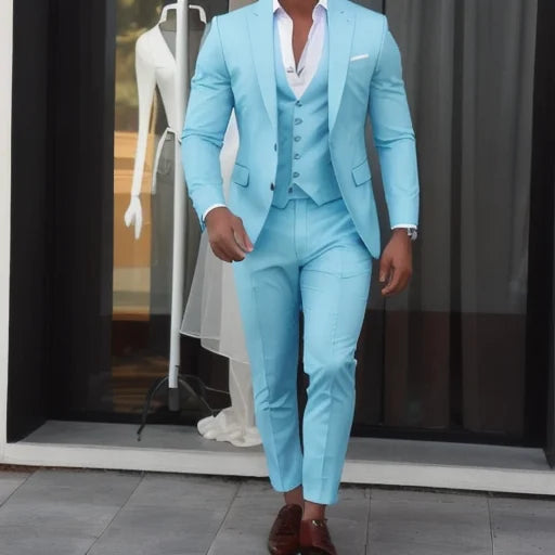 Enhance your formal wardrobe with this eye-catching light blue three-piece suit, perfect for weddings and special events.